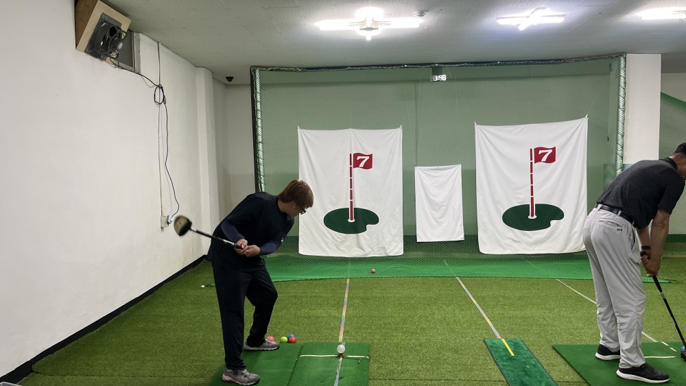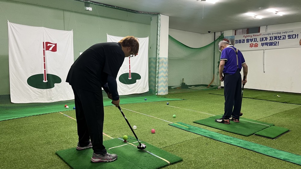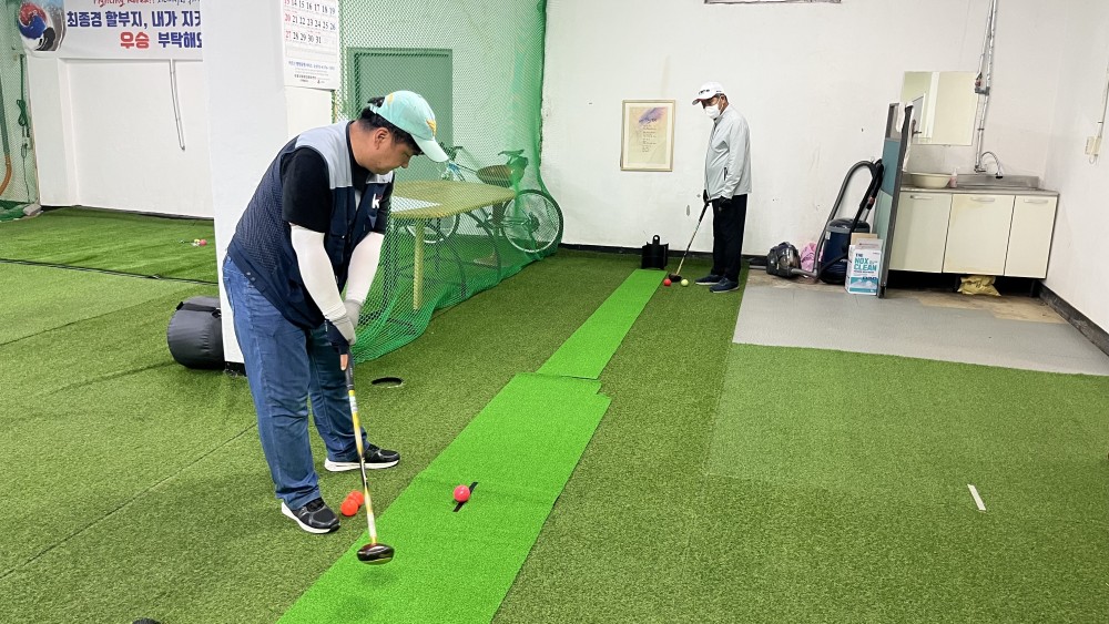 우천으로 인해 야외수업이 불가하여 실내 파크골프장에서 퍼팅과 티샷 연습 중