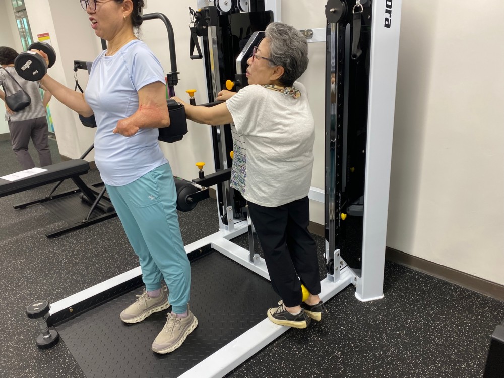 서로 겹치지 않게 자신에게 필요한 운동을 진행하는 체력증진 수업 현장